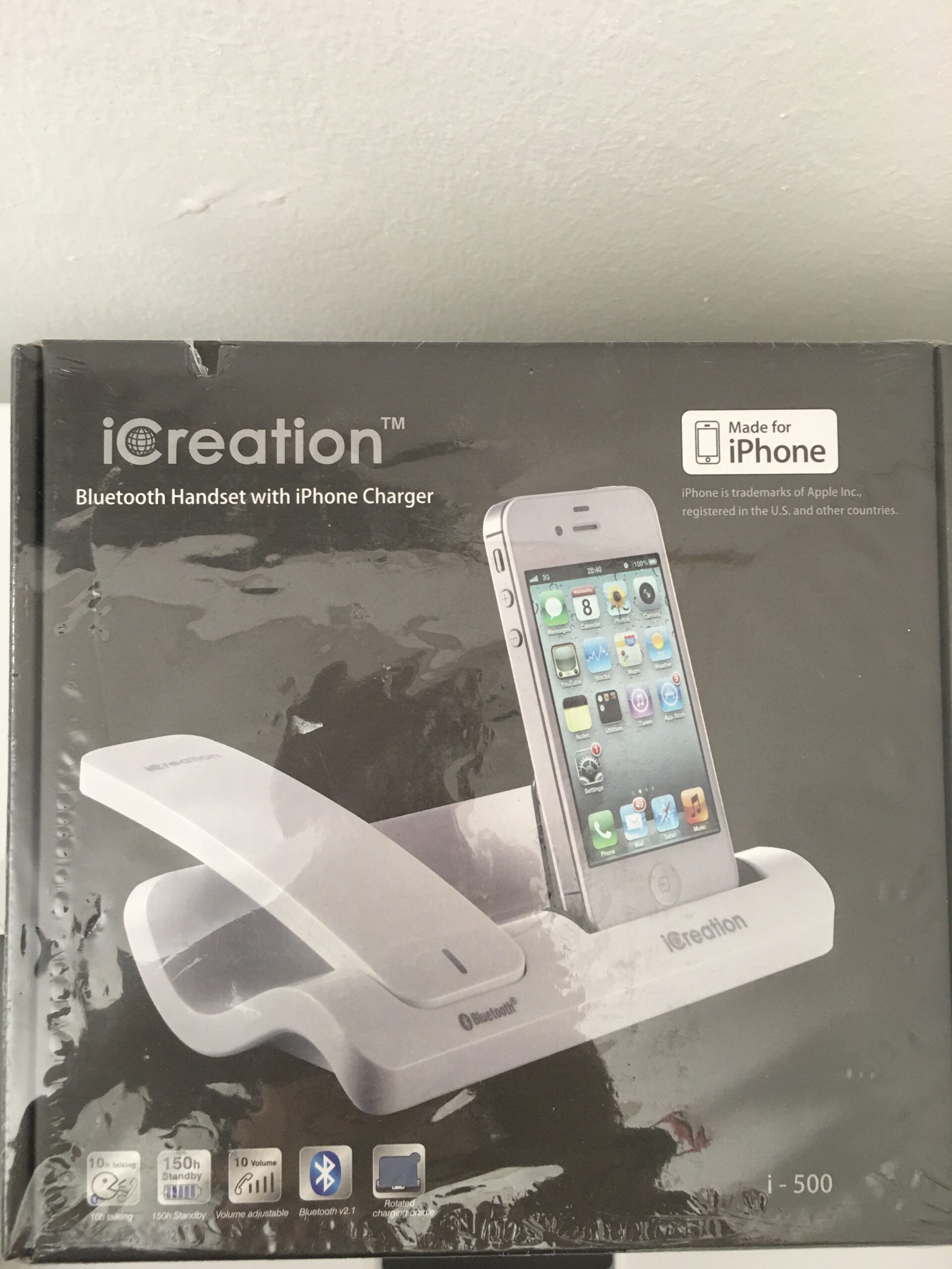 Microtelefono Bluetooth iCreation I-500 con base di ricarica per iPhone.Base di ricarica orientabile, autonomia in standby 150h, volume in ricezione regolabile su 10 livelli.Permette una considerevole riduzione all’esposizione di emissioni radio del cellulare